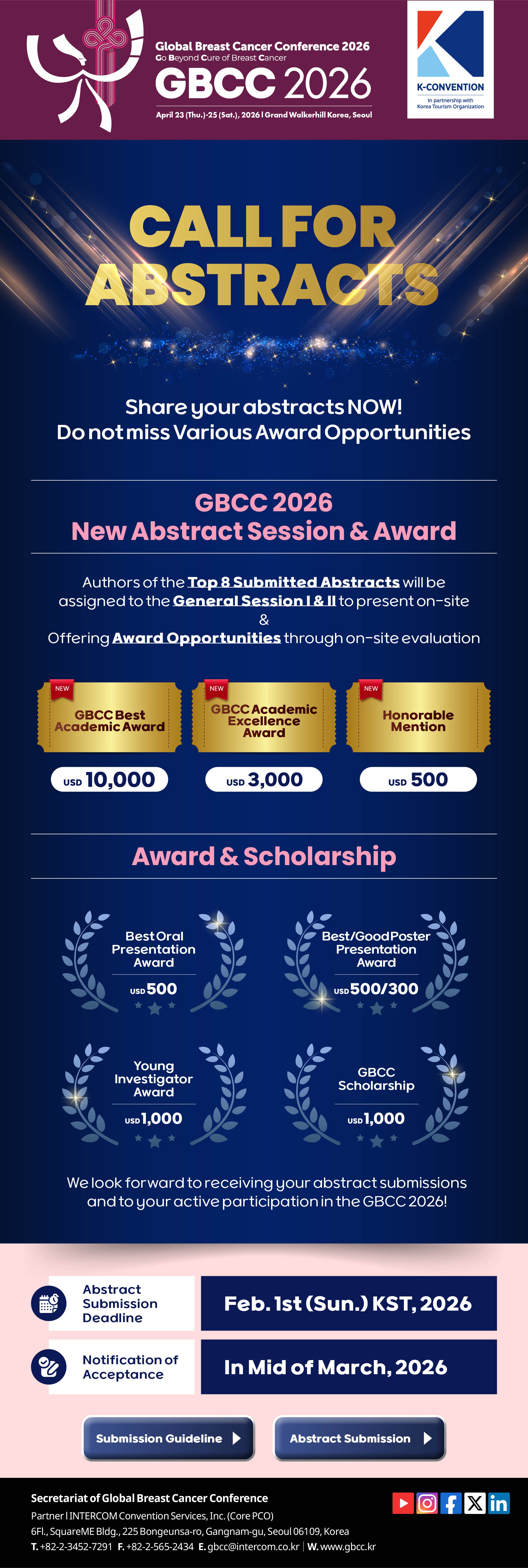 このたび、韓国Global Breast Cancer Conference (GBCC) 2026 において、新たに優秀演題を表彰する「Abstract Award」が新設されました。この表彰制度は、優れた研究成果を顕彰し、より多くの研究者の参加を促進することを目的としており、受賞者には賞金も用意されているとのことです。